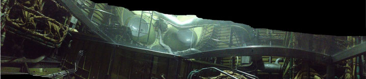 Die letzten beiden Fotos sind durch Plexiglas fotografiert und zeigen das Cockpit, sowie den Laderaum/ Maschinenraum von unten/ innen - und damit einen Teil des Druckkörpers...