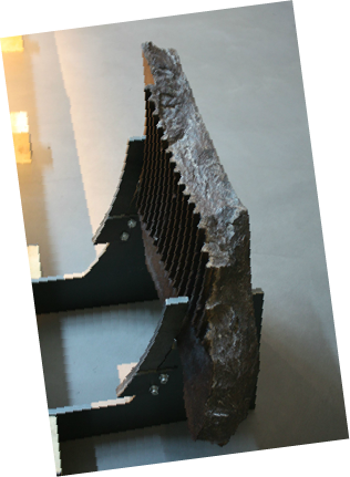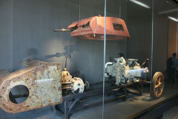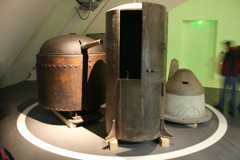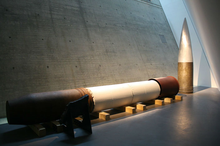 Geschoss, des 88 cm Eisenbahngeschützes "Dora", im Fordergrund, Stück aus dem Lauf des Geschützes, mit Feldern und Zügen.